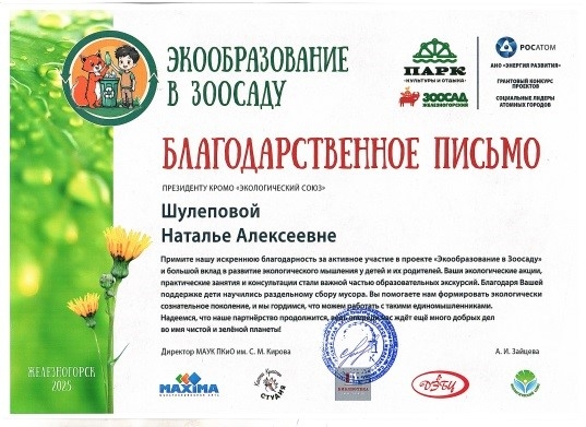 «Примите нашу искреннюю благодарность за участие в проекте «Экообразование в Зоосаду» и большой вклад в развитие экологического мышления детей и их родителей. Ваши экологические акции практические занятия и консультации стали важной частью образовательных экскурсий.